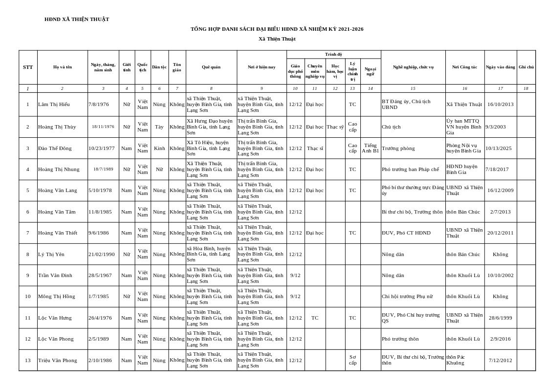 | Tiêu đề văn bản | Danh sách đại biểu Hội đồng nhân dân xã nhiệm kỳ 2021-2026 xã Thiện Thuật | ||