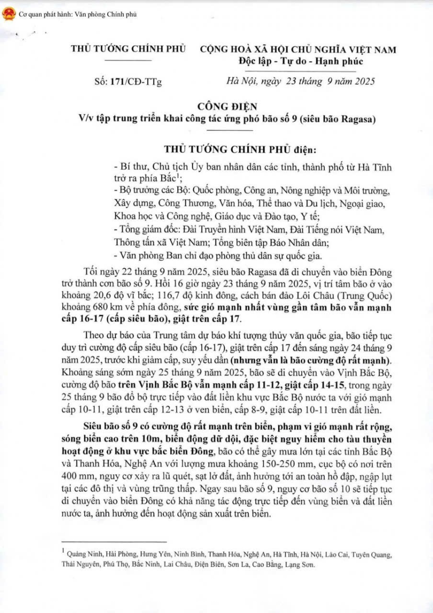 Thực hiện Công điện số 171/CĐ-TTg ngày 23//2025 của Thủ tướng Chính phủ về tập trung triển khai công tác ứng phó siêu bão số 9 (Ragasa), UBND xã Thiện Thuật đề nghị toàn thể nhân dân trong xã nâng cao cảnh giác, chủ động phòng chống, cụ thể: