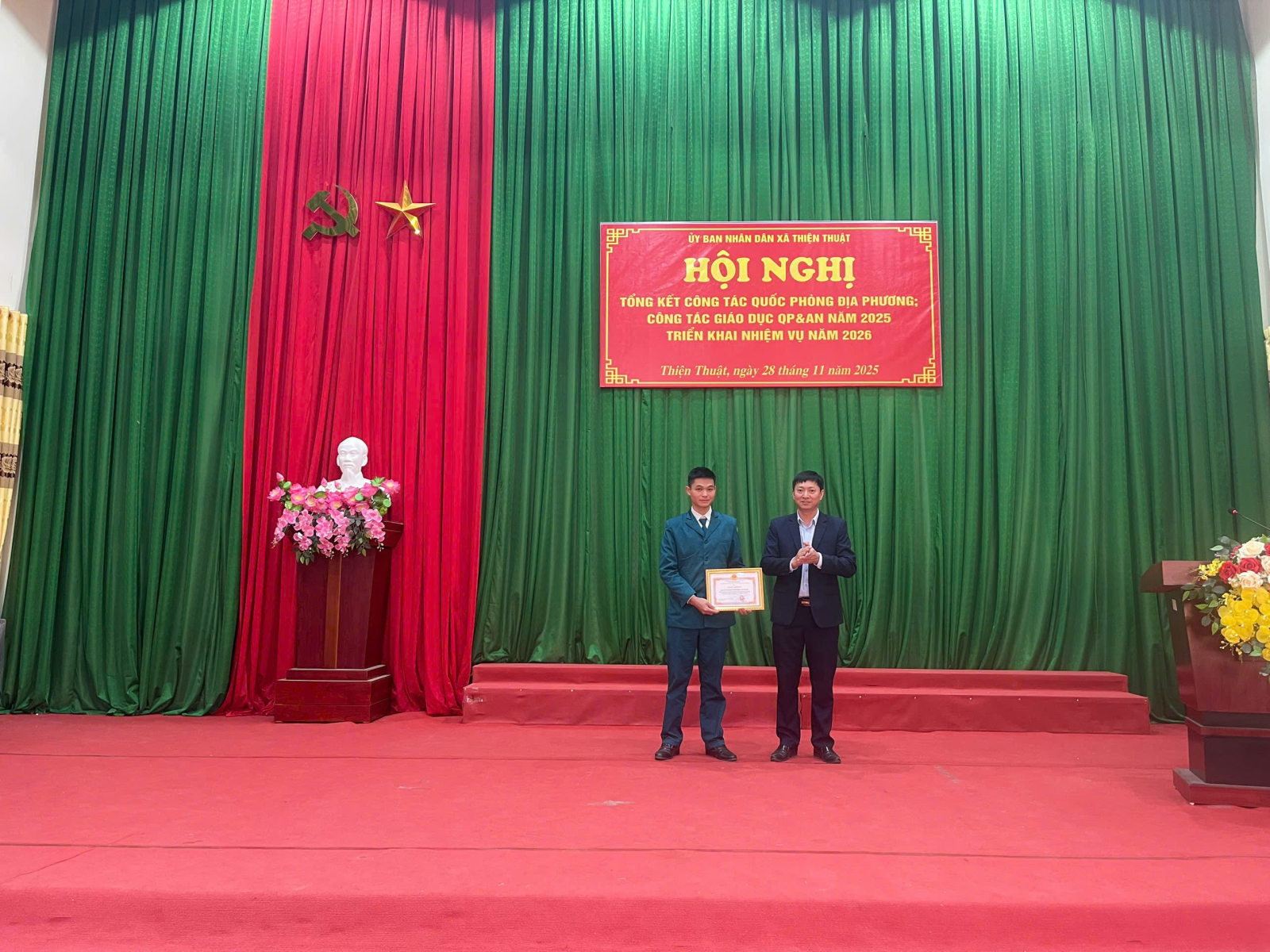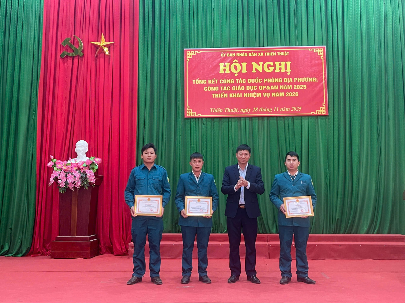 ▶️Nhân dịp này, UBND xã Thiện Thuật đã trao tặng giấy khen cho 01 tập thể và 04 cá nhân có thành tích trong công tác quốc phòng địa phương năm 2025.